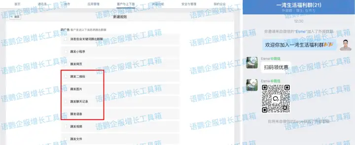 防骚扰功能支持踢出发二维码、语音或聊天记录的成员。新客户加入外部群时,群主可通过进群消息查看客户信息,若发现其非企业真实客户,可迅速设置防骚扰权限或进行投诉,有效维护群组健康。