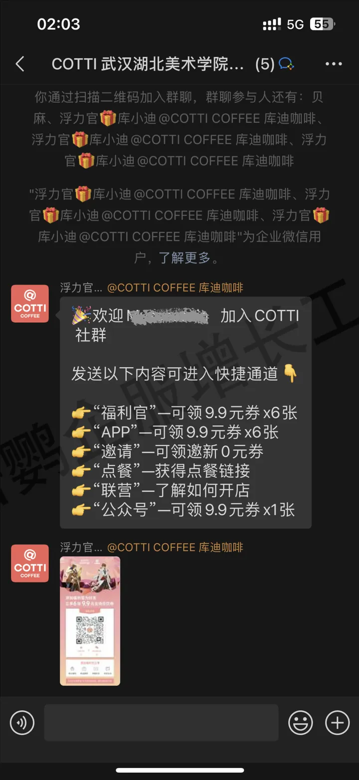 所以即使不能批量设置群公告,但是像很多福利群、活动群都是通过语鹦企服的「入群欢迎语」功能,在客户进社群后,尽快自动推送入群福利、规则等,还能自动嵌入客户名称,让新进客户得到快速响应,并且减少人工运营成本,提升效能。比如COTTI咖啡的企微社群在新客户进入后,就自动发欢迎语加链接,让客户快速领取福利。