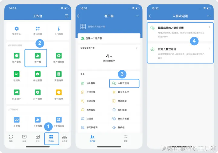 如果是在手机上操作的话,可打开企业微信后,点击「工作台」—「入群欢迎语」—「配置成员入群欢迎语」。