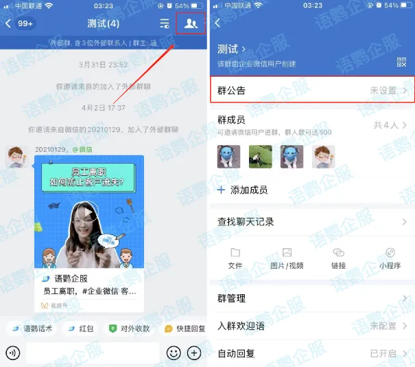以上就是《企业微信群公告在哪里?企业微信群公告能批量设置吗?》的全部内容了。随着企业微信日益完善,很多功能也会陆续满足企业所需,而企业的需求也是可借助第三方工具来快速实现,降本增效。当然,语鹦企服的功能不仅于此,更多功能欢迎大家前往语鹦官网免费体验。