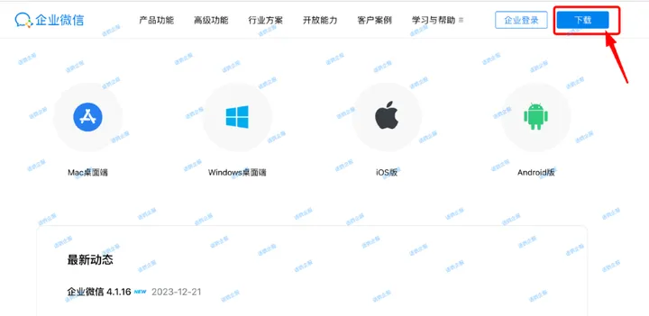 在登录企业微信电脑端之前,我们需要进入「企业微信官网」,点击右上角「下载」即可在电脑系统中安装企业微信电脑版,电脑版的企业微信支持Mac和Windows系统运行。