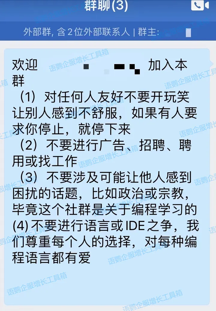 企业微信群聊除了可以通过设置防骚扰对群聊的信息进行规避外,还可以在入群欢迎语加入言行规则,规范群成员言行,防止一些不利于群发展的事情发生,帮助运营人员管理社群环境,提高社群运营质量。