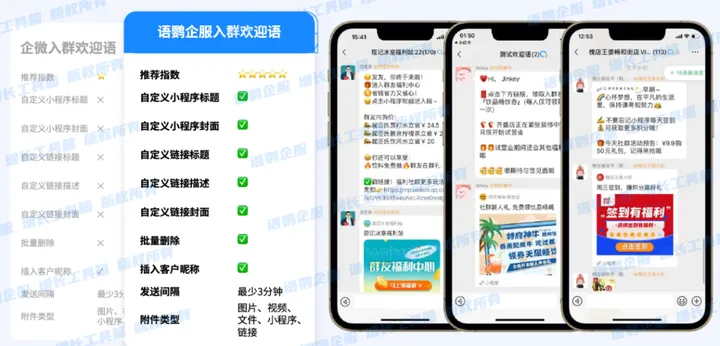 除了企微自带的入群欢迎语外,企业也可以语鹦企服的[入群欢迎语]功能,相比企业微信自带的多了自动@客户ID、自定义修改小程序的封面、标题还有链接标题等功能,让客户进入社群第一时间聚焦群规则和福利点,帮助管理员规范社群环境,维护客户热情。