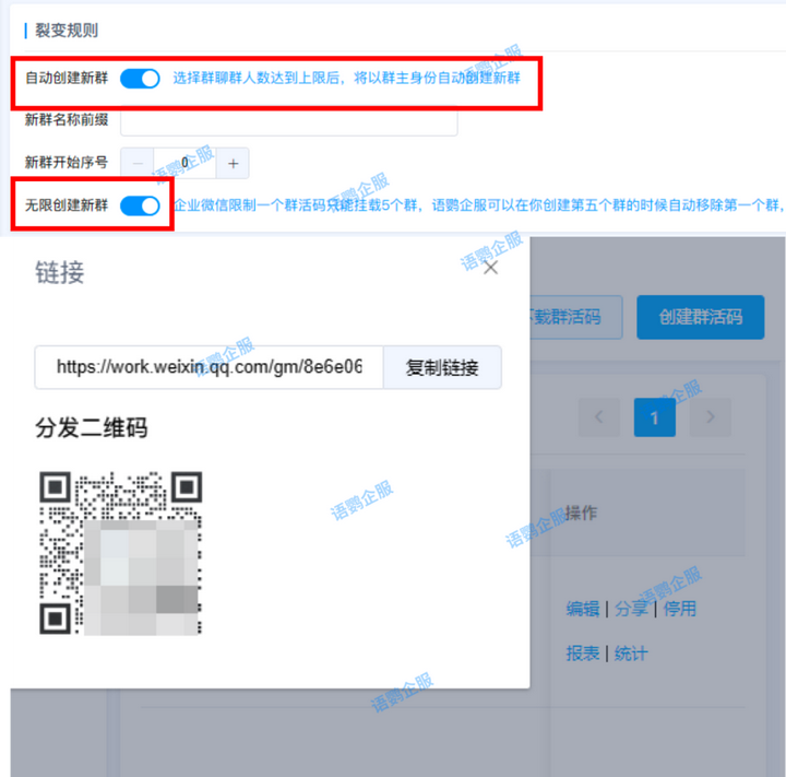 然而,部分商家可能会遇到新的困扰。在使用企微自带的传统群活码时,最大的问题是每个群只能连接五个群组,并且超出限制后便无法继续添加更多用户。这个问题,使用语鹦企服工具箱的进群活码功能可以解决,不受群活码的1000人上限,并且当达到200人后自动创建新的群组,避免用户流失。