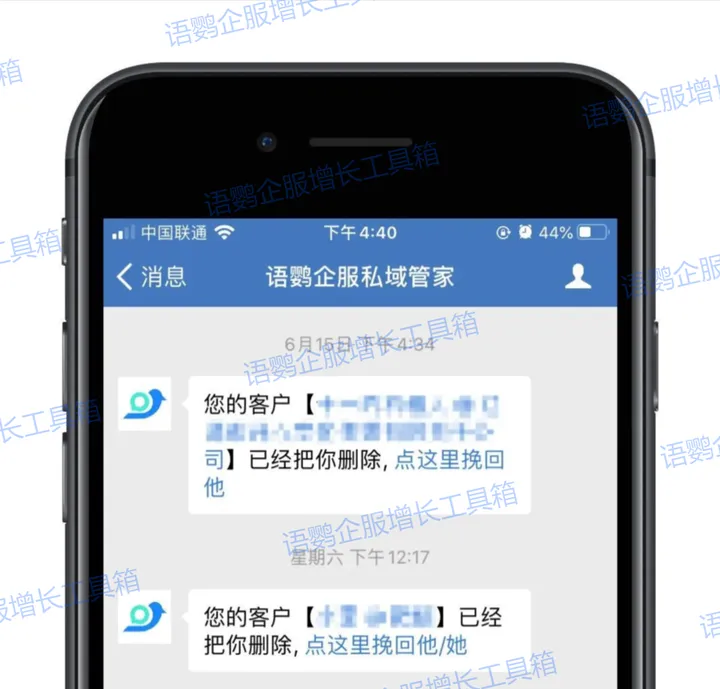 若是客户在离职继承的过程中非常容易流失,那么平时日常里尽可能的减少流失的客户才是关键,企业开开启语鹦企服流失提醒功能。该功能能够实时监测企业微信中客户和员工的流失情况,并提供相应的提醒和一键挽回。当客户删除企业微信时,后台会收到提醒,通过提醒链接重新申请添加客户,尽可能减少客户流失的情况。