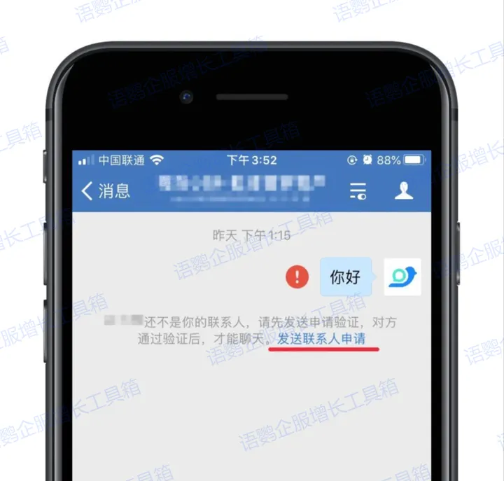 通过链接给客户随意发送一条消息触发“发送联系人申请”功能后,发送添加客户申请,等待客户同意即可挽回流失的客户。