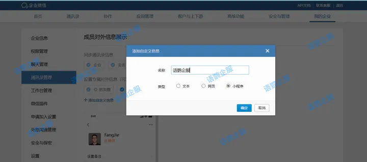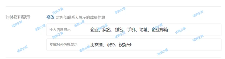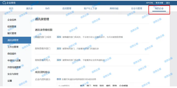 第一步:打开企业微信后台,点击【我的企业】,进入【通讯录管理】页面,下滑至【对外资料显示】一栏