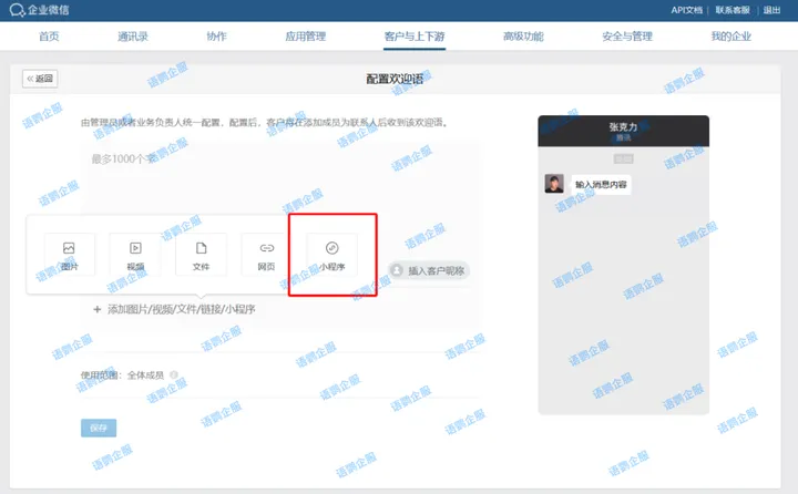 第二步:进入设置页面后选择添加小程序,填写相关信息并确认后即可成功设置欢迎语