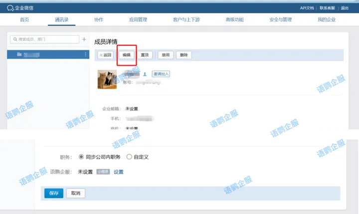 第四步:管理员可以点击上方工具栏中的【通讯录】为企业成员添加小程序,选择需要添加小程序的企业成员,点击【编辑】,下滑至页面最下方,点击设置