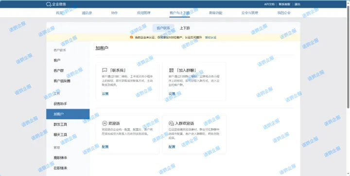 第一步:管理员点击【客户上下游】,点击【加用户】,随后选择【配置】欢迎语或入群欢迎语