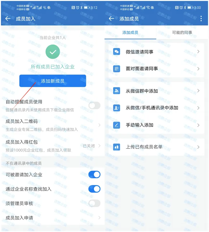 管理员只进入企业微信【工作台】——选择【成员加入】——点击【添加新成员】,便可快速操作。