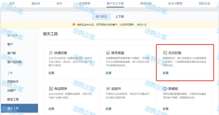 在PC版中,需要管理员先进入企业微信管理后台,在企业微信管理后台的【客户联系】-【聊天工具】内,配置【自动回复】页进行关键词设定及消息回复设置。