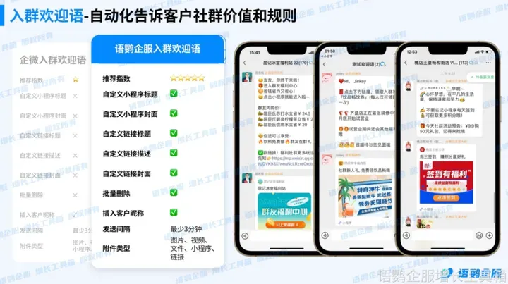 企业可启用语鹦企服的入群欢迎语功能,自定义稍后信息,如小程序名称、封面、简介等,让管理人员能更具个性地欢迎新人加入,增强团队向心力。