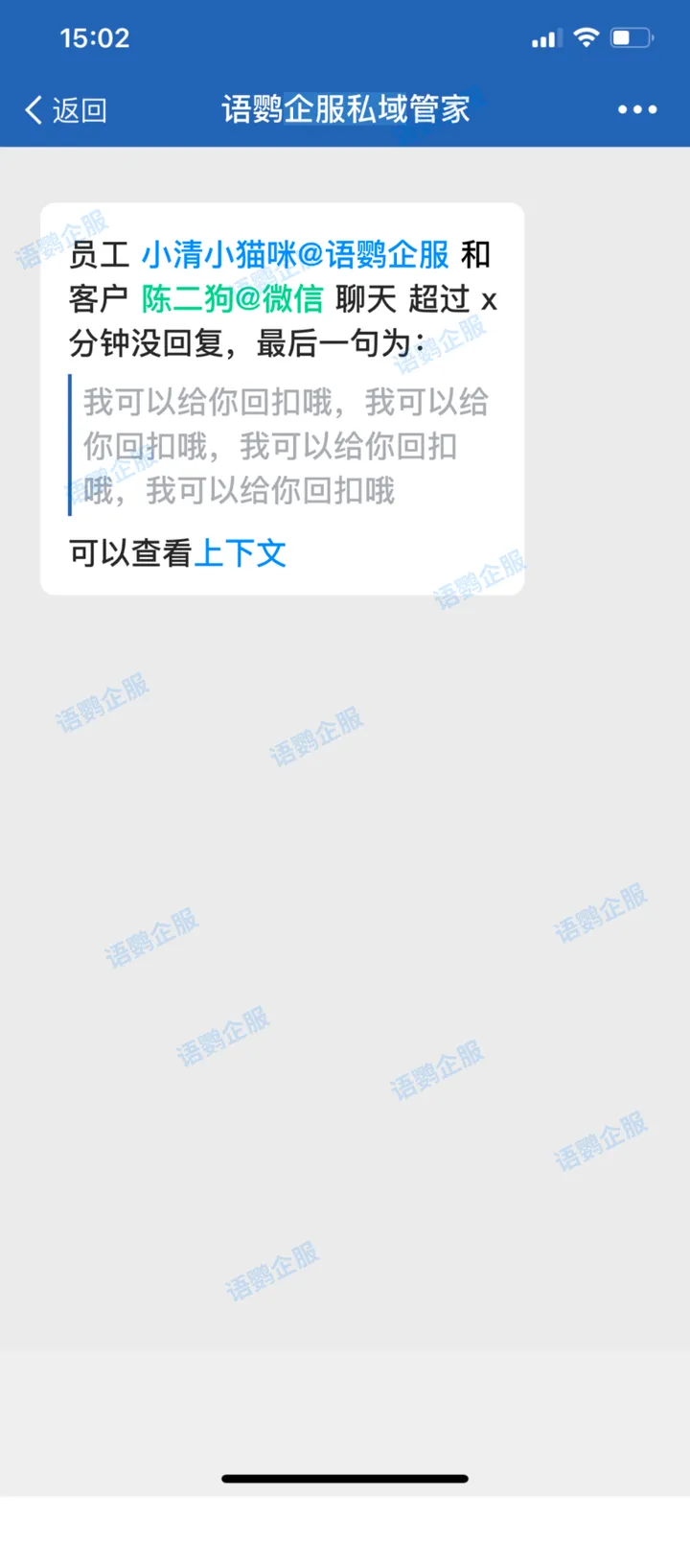 有些企业规定每个员工必须在规定时间内回应客户问题,明确了服务和质量标准。想要监管员工与客户的沟通效率,可以利用语鹦企服的会话存档的超时提醒功能。提醒工作在一线的员工要即时提供服务,并告知上级进行监督,这样能提高公司在提升客户服务上的科学依据,推动业务的改进与进步。