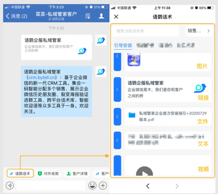 那如果想设置其他格式的话术库,可以利用只需进行一次配置的语鹦企服跨平台话术库去实现。语鹦企服工具箱的话术库支持文本、图片、视频、文件、网页、链接、小程序等多种格式的自动回复,满足大部分企业的需求。同时,各部门均能独立制定各自的话术库。只需更改一次数据,全公司即可实时共享,实现高效传播。