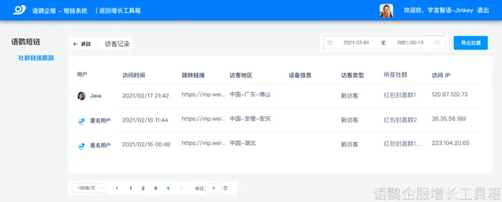 除此,还可通过语鹦企服的「社群链接跟踪」功能,企业可以方便地填写社群链接的相关信息,创建并传播自定义的链接。这些链接不仅可以用于引导客户参与活动、领取优惠券等,还可以在后台实时监控和分析其点击数和访问数。