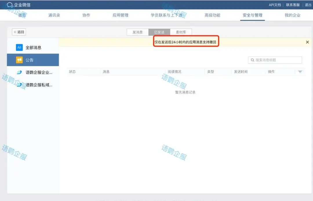 以上就是关于《企业微信公告怎么删除?撤回或删除已发送的公告后还能看到历史记录吗?》的全部内容了。随着企业微信在企业中的广泛应用,有效地管理公告变得越发重要。虽然企业微信提供了基础的撤回和删除功能,但对于希望在删除公告后还能查看历史记录的企业来说,语鹦企服的会话存档功能提供了一个更全面的解决方案。通过这样的第三方服务,企业不仅能够保持通讯的透明度和可追溯性,还能在确保合规的同时提升通讯管理的效率。