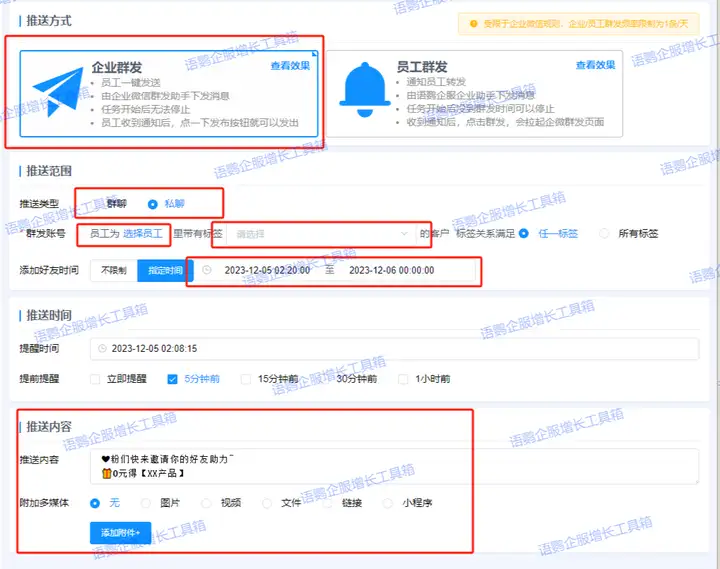 企业还可以配合客情侧边栏设置客户回访时间,比如入池后的第七天回访售后是一个很关键的激活客户节点,企业可以询问产品使用情况和搭配首单福利提高新客破冰转化。客情侧边栏配合定时群发功能导入人群和回访话术,实现自动定时批量回访客户,确保不漏掉任何一个客户,为企业与客户之间建立了一种长效的沟通机制,让企业的关怀始终伴随着客户。