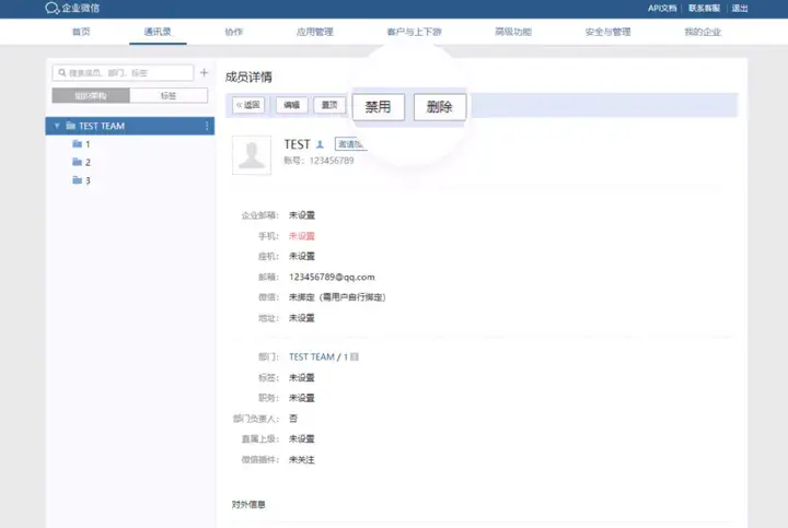 目前来说,企业微信是可以直接禁用员工登录公司的,可以由企业管理员进入企业微信管理后台,在通讯录板块下,点击需要冻结的员工账号,选择【禁用】即可。