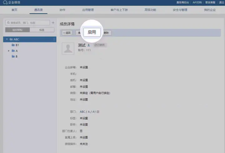当员工企业微信被禁用后,为了员工之后可以正常参与工作,也需要解除企业微信禁用限制,管理员可以进入管理后台点击【通讯录->搜索成员、部门、标签】搜索到已禁用的成员,点击【成员详情->启用】,解除禁用状态。