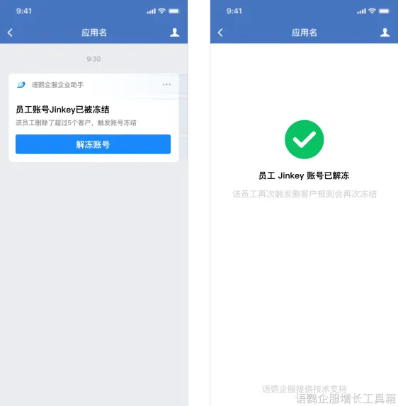 另外,不仅可以直接禁用员工登录公司,而且通过语鹦企服的【禁止删好友】功能可以自动识别员工删除客户行为,直接冻结员工账号,禁用员工登录公司,从而降低客户流失风险。在该功能下,当员工删除客户达到管理员设置的上限后,比如当员工删除客户数大于等于1人时,就会触发【员工账号冻结】。被冻结后,员工账号会被强制登出并收到禁用提醒。