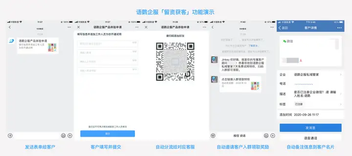 此外,企业还可使用语鹦企服留资表单功能,客户填写手机号等信息后,即可自动分流到对应的客服或群聊,而客服会自动发送对应的福利或入群邀请欢迎语,并将表单信息自动备注到客户名片,实现自动化获客及转化。