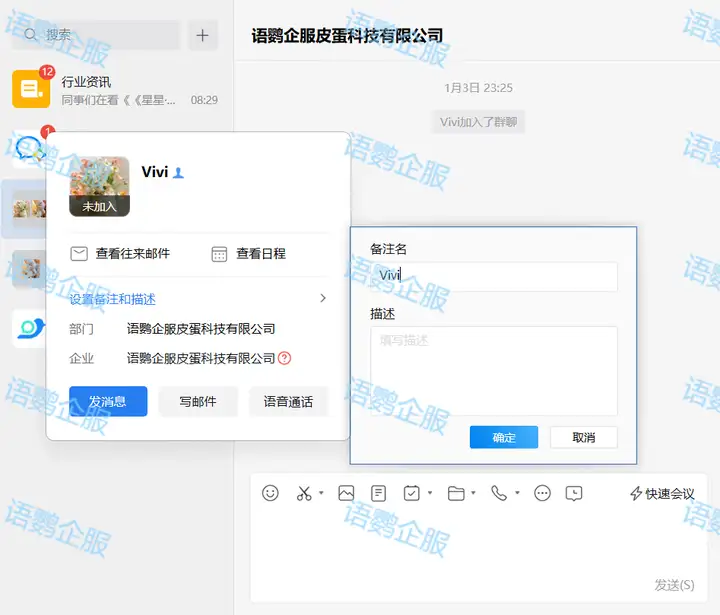 在使用企业微信添加微信好友时,将无法读取微信的备注信息,企业微信,仅能读取微信昵称及头像信息。那么在企业微信中,我们该如何给客户打备注呢?在电脑端上,需先打开与客户的对话窗口后,再轻击对方昵称,便能发现并使用备注及描述功能了。