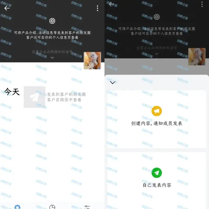 企业可以在【工作台】→【客户朋友圈】→【发表】中,便捷地发布各类信息至客户的微信朋友圈,如活动资讯、新品动态以及专业知识等等,同时还能随时回应他们的评论互动。