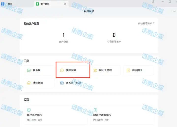 首先进入企业微信的“客户联系”模块,然后选择“工具”点击其中的“快捷回复”功能按钮。虽然企业微信所提供的快捷回复能提高员工的工作效率,然而其功能尚有局限性,仅支持文本内容的添加,而缺乏插入图片等元素的功能。