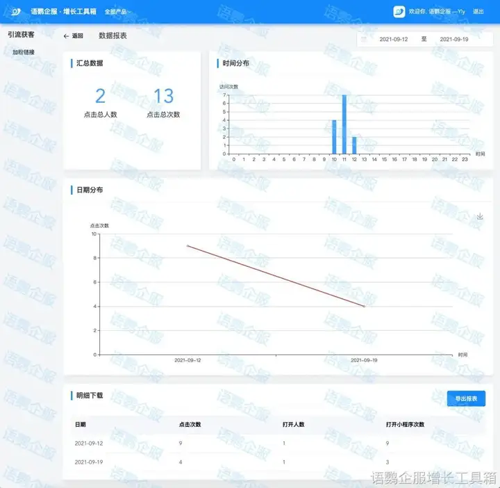 通过语鹦企服【加粉链接】功能创建获客链接后,无论多少用户通过链接添加企业微信都不会产生额外费用,大大降低企业引流成本。不仅如此,企业还可通过【加粉链接】功能获取相关获客链接的点击总人数、点击总次数、访问时间分布等数据报表,更方便企业统计、分析不同线上渠道的引流效果是否达到预期。