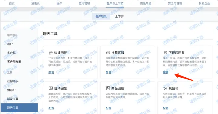企业微信设置员工下班后自动回复的方法很简单!只需要管理员进入企业微信管理后台,点击“客户与上下游”,进入“客户联系”页面,在“聊天工具”板块,即可找到“下班后自动回复”功能,点击进入配置页面。