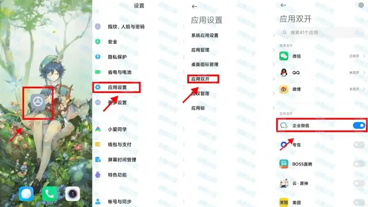 在手机中找到【设置】界面并选择【应用设置】,而后进入【应用双开】界面搜索或直接查找企业微信APP开启应用双开按键,即可获取企业微信分身。