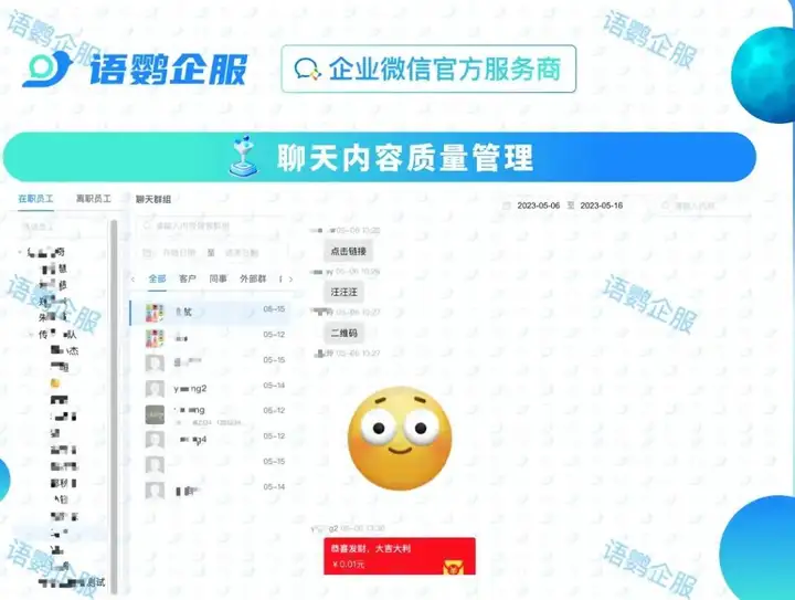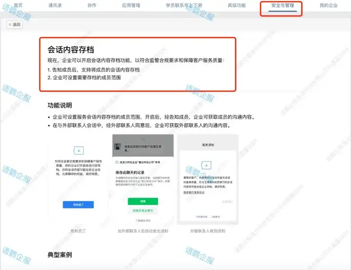 语鹦企服提供的「会话存档」功能支持企业对员工内部、员工与客户间的工作沟通内容和文件进行存档,满足企业的合规性和风险控制要求。