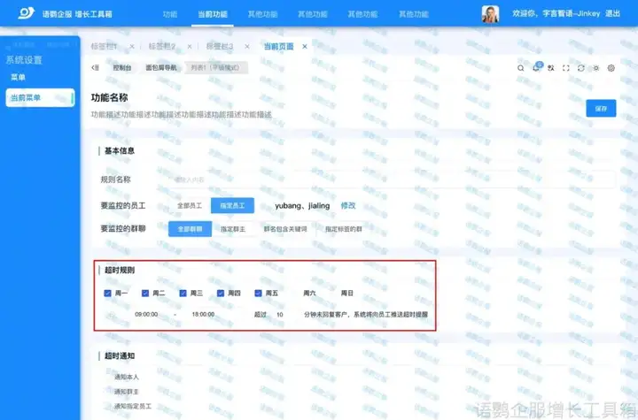 对于需要及时提醒的事项,特别是在客户运营管理方面,企业可以开启语鹦企服“超时回复提醒”功能,并针对重要信息设置提醒规则,如果成员在规定时间内未回复,系统会自动提醒,确保重要信息及时得到关注和处理,避免遗漏或延误。