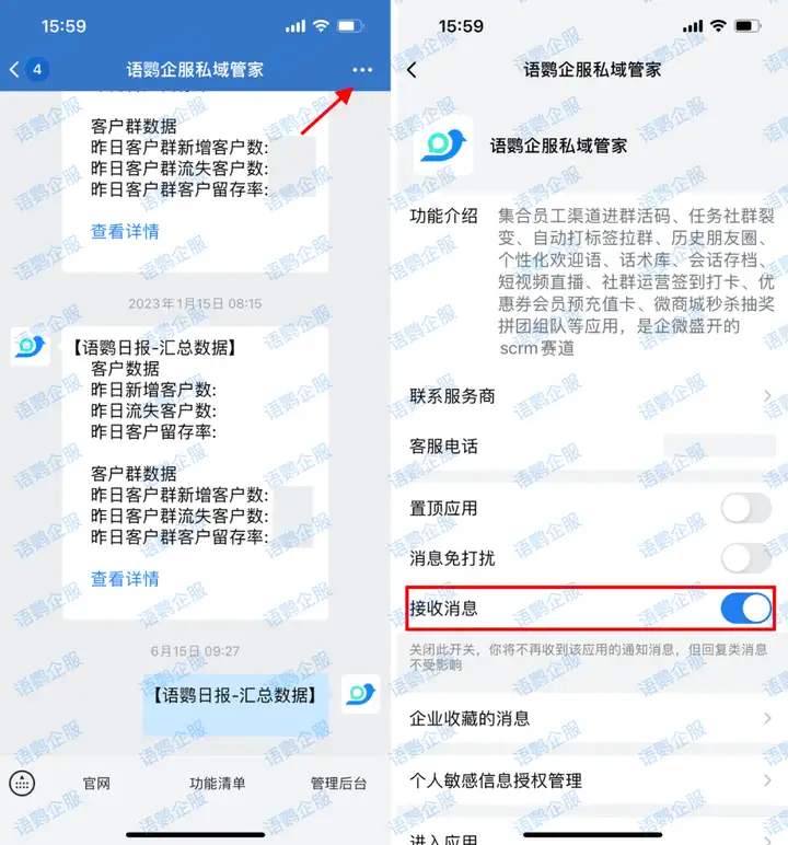 以上就是关于《如何实现企业微信客服每日咨询回复统计?企业微信中如何取消/开启应用消息提醒?》的相关内容了。总而言之,高效的客服管理和顺畅的信息接收是企业微信运营的两个重要方面。借助语鹦企服等专业工具,企业可以轻松实现客服数据统计和分析,优化客服资源配置,提升客户服务质量。同时,灵活设置企业微信应用消息提醒,可以帮助我们减少信息干扰,提高工作效率。更多企业微信私域玩法,欢迎关注语鹦企服私域管家。