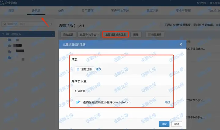 在通讯录页面,点击“批量设置成员信息” ,选择需要设置的成员,和第1)步已关联的小程序,并填写小程序信息,保存即可。