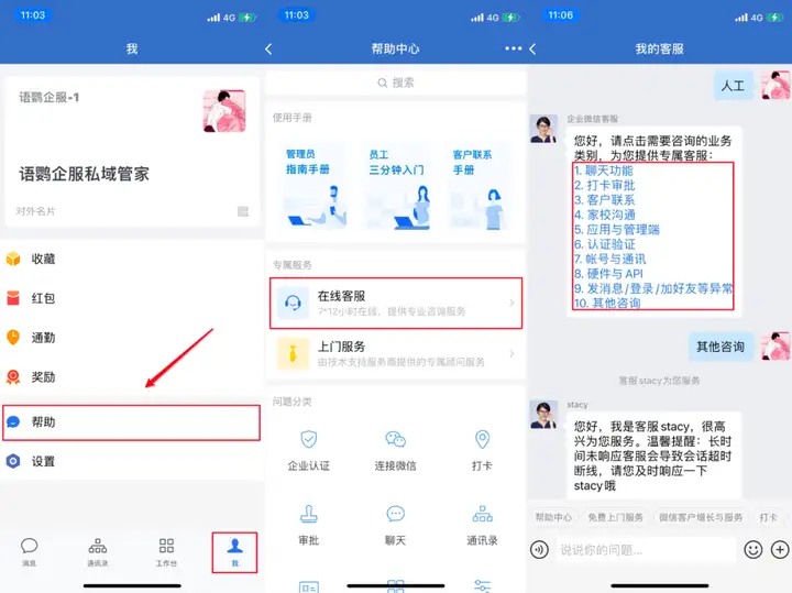 企业微信官方网站和APP内都提供了帮助中心,涵盖了常见问题解答、功能介绍、操作指南等内容。你可以尝试在【”App-我-帮助”】中找到人工客服,也可通过帮助中心,搜索相关关键词,自助解决问题。