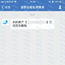 如图所示,一旦客户在微信上删除了你的企业微信,系统就会发送一条实时通知到你已安装的语鹦企服私域管家聊天窗口,提示“您的客户xx已经把你删除,点这里挽回他/她”。