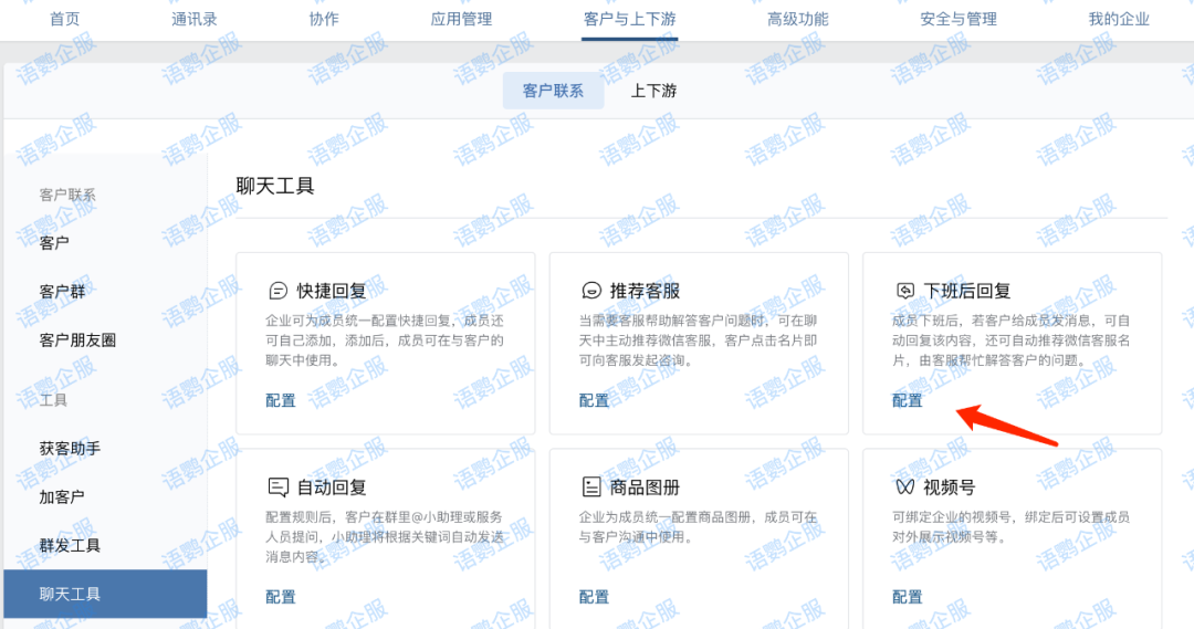 只需要企业管理员登录企业微信管理后台,在“客户与上下游”页面,找到“客户联系”功能,并点击“聊天工具”板块,即可找到“下班后自动回复”功能,在配置页面中,你可以设置自动回复的开启时间段、回复内容,以及是否推荐微信客服名片。