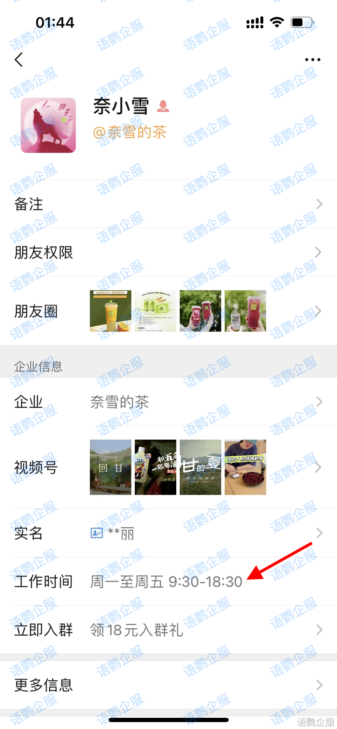 ③修改对外名片:企业可以通过企业微信对外信息展示页、修改昵称等技巧,让用户第一时间了解到上下班时间,避免带来投诉。例如,奈雪的茶就通过在个人信息页面展示工作时间,告知用户周一到周五的工作时间。