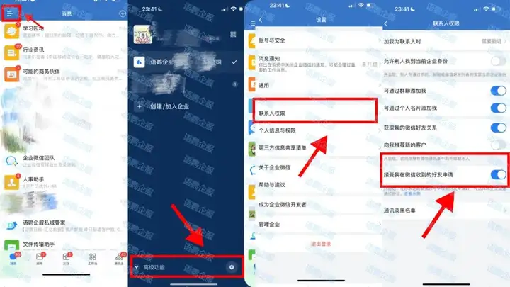 企业微信可以接受微信的好友申请。在企业微信APP的信息页面中选择右上角的”横线“进入个人主页后,可选择高级功能-设置中的【联系人权限】,而后即可开启【接受我在微信收到的好友申请】,设置后即可实现企业微信接收微信好友申请。