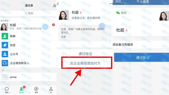 开启【接受我在微信收到的好友申请】后,每当用户搜索、添加企业的个人微信号时,我们的微信这边就会出现通过验证和去企业微信添加对方两个选项,我们点击【去企业微信添加对方】,待跳转到企业微信添加对方后,再切换到个微通过用户的好友验证,即可一次扫码将用户同时加到企业微信与个微了。