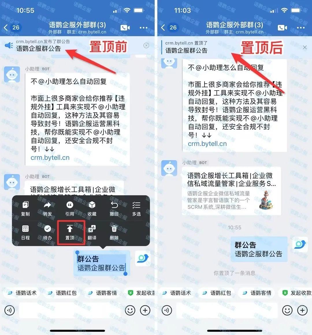 以上就是关于《企业微信群公告怎么置顶?企业微信群置顶别人消息怎么设置呢?》的相关内容了。总的来说,企业微信的群公告和置顶消息功能,可以帮助企业更高效地与客户进行沟通,传达重要信息,提升私域运营效率。但并不是所有人都可以发布群公告和置顶,企业需要熟悉企业微信功能才能更好地提高效率。更多企业微信私域玩法,欢迎关注语鹦企服私域管家。