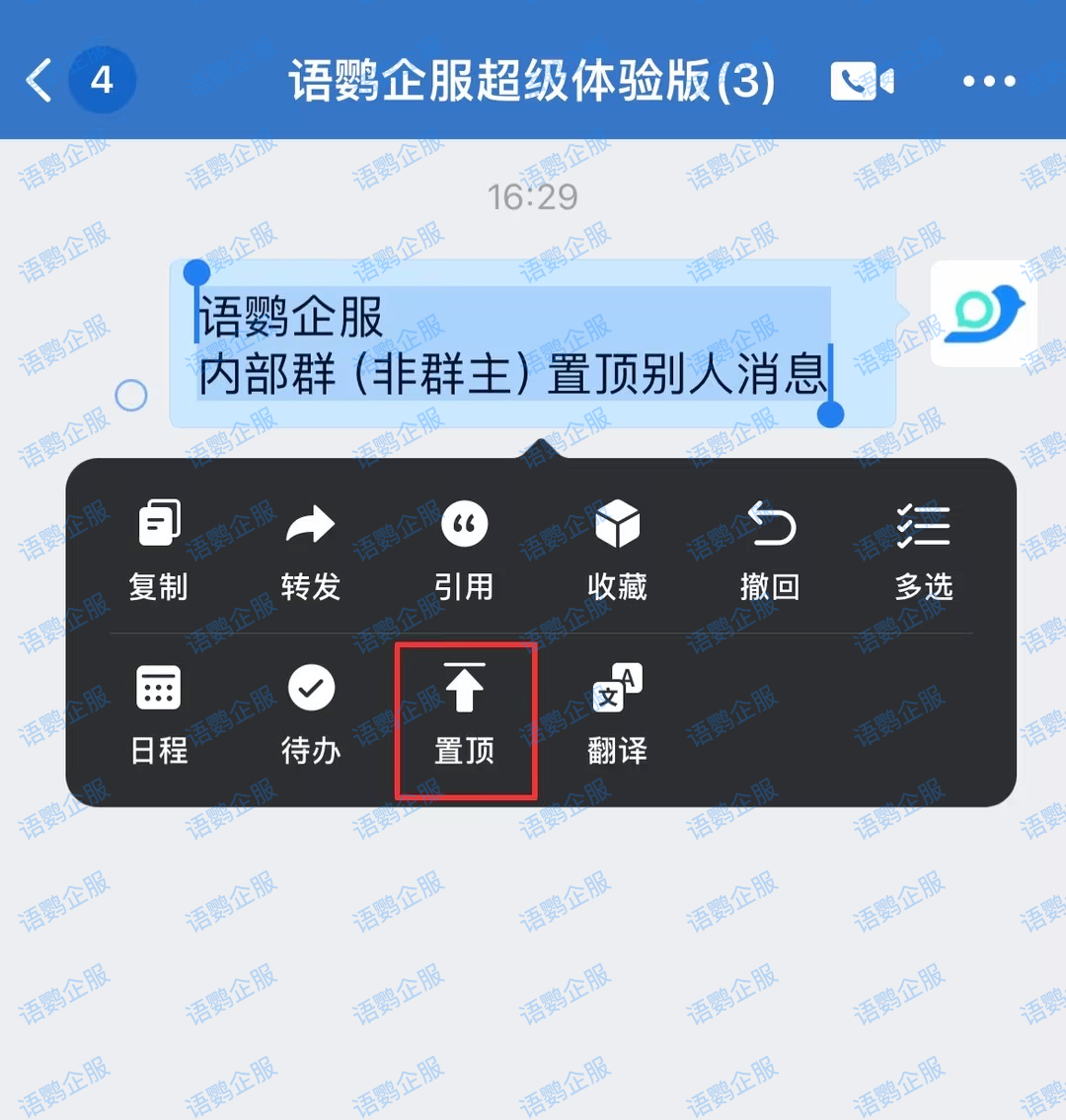 而如果是在企业微信内部群中,任何一个群成员都可以直接长按别人的消息进行置顶,也可以将自己发布的消息进行置顶!例如,当您看到同事发布的关于项目进度更新的重要通知时,您可以直接长按该消息,选择“置顶”选项,将该消息置顶到群聊顶部,方便其他同事查看。
