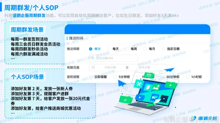 针对不同类型的客户,企业可以利用语鹦企服的「个人SOP」功能,设置企业微信添加好友后的自动化流程,例如在添加好友第二天,自动发送一张新人优惠券;添加好友第三天,自动邀请客户进群,提升运营效率。