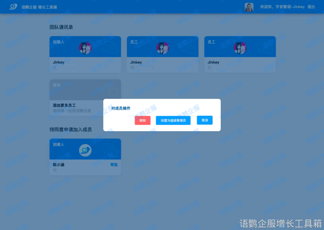 如果是需要变更语鹦企服管理员权限,则需要创建人或管理员 打开语鹦企服增长工具箱首页-系统设置-通讯录,找到要设置的人,点击名片,弹出的对话框点击『设置为管理员』即可。