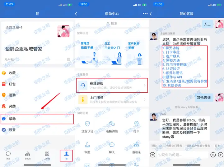 2)在线客服:对于一些较为复杂的问题,可以通过企业微信后台提交工单联系在线客服。在线客服会根据问题的类型和紧急程度进行处理,并提供专业的解决方案。