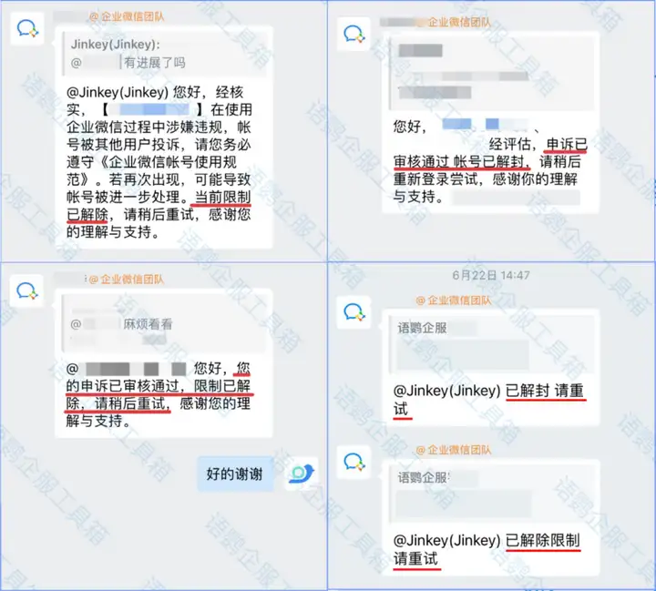 正如上文所说,企业微信没有24小时人工客服解封电话。如果你的企业微信账号被封禁,不要慌张,首先要弄清楚被封禁的原因。一般情况下,企业微信会通过站内信通知你账号被封禁的原因。你可以根据具体原因进行申诉。申诉的入口通常位于封禁通知中,提交申诉后,耐心等待官方的审核结果。