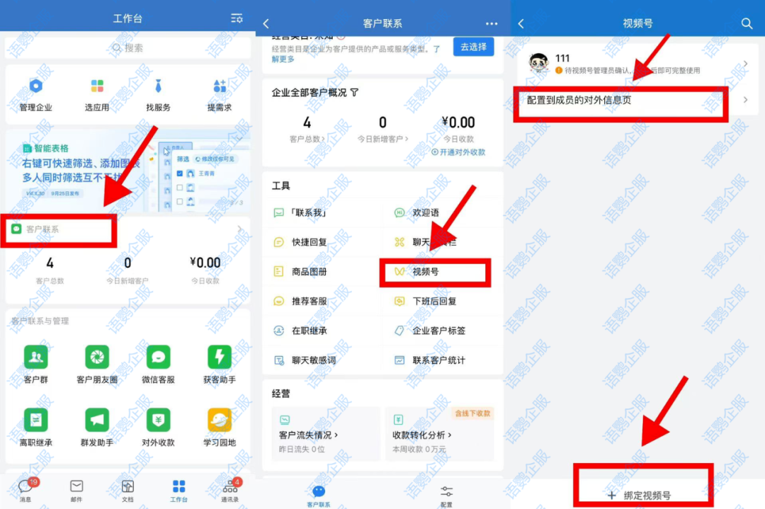 企业在企业微信【工作台】—【客户联系】—【工具】—【视频号】界面中选择【绑定视频号】,即可在视频号主页展示添加企业微信客服入口。但目前因视频号规则调整,视频号已经不支持在主页和直播中配置【企业微信】。若之前已经配置且没有解绑,即可继续使用【添加企业微信】功能。