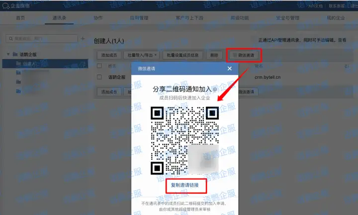企业微信提供了多种方式邀请成员加入到对应的部门: